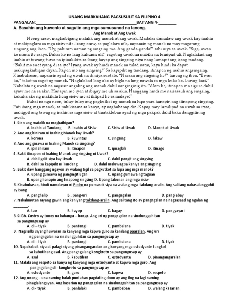 Grade 4 Unang Markahang Pagsusulit Sa Filipino | PDF