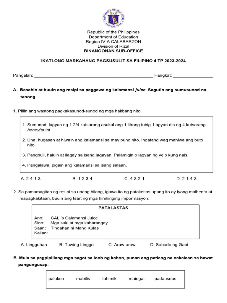 Unang Markahang Pagsusulit SA Filipino III - UNANG MARKAHANG PAGSUSULIT ...