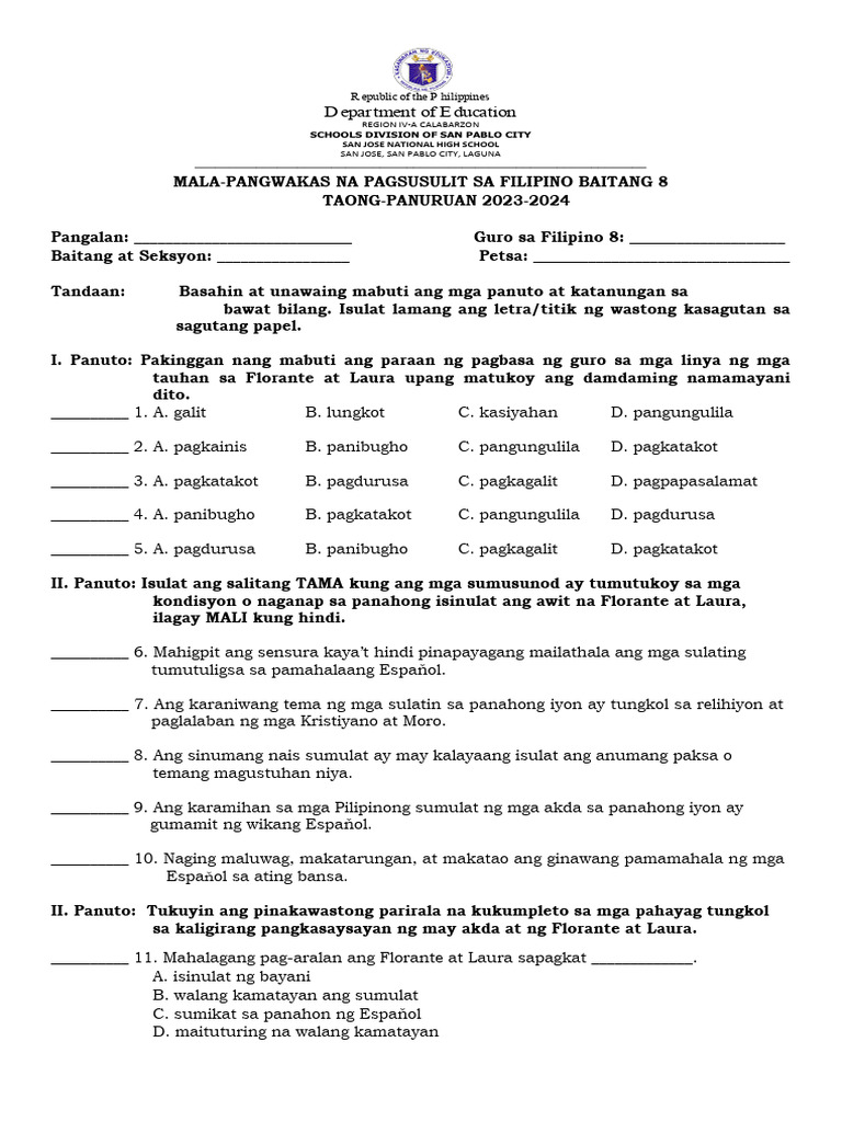 G8 Mala Pangwakas Na Pagsusulit Sa Filipino Baitang 8 A4format 22 23 1 ...