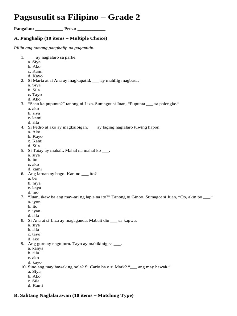 Pagsusulit Sa Filipino para Sa Baitang 2 | PDF