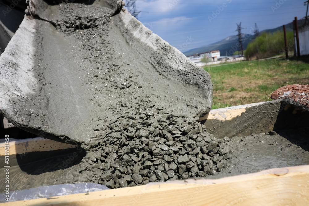 worker fill in cement in the construction of the concrete foundation ...