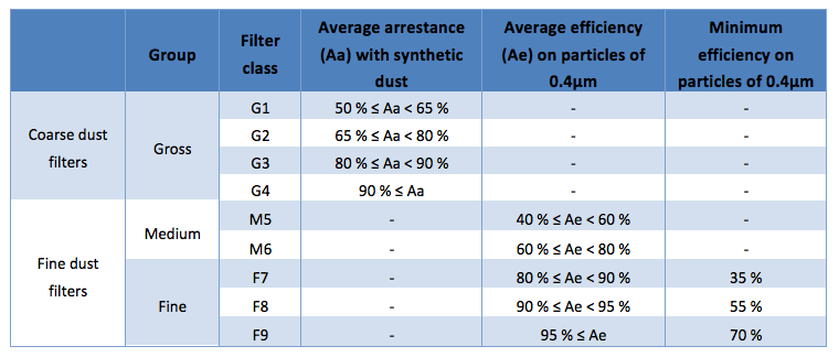 Classification into different filter classes according to EN 779 and EN ...