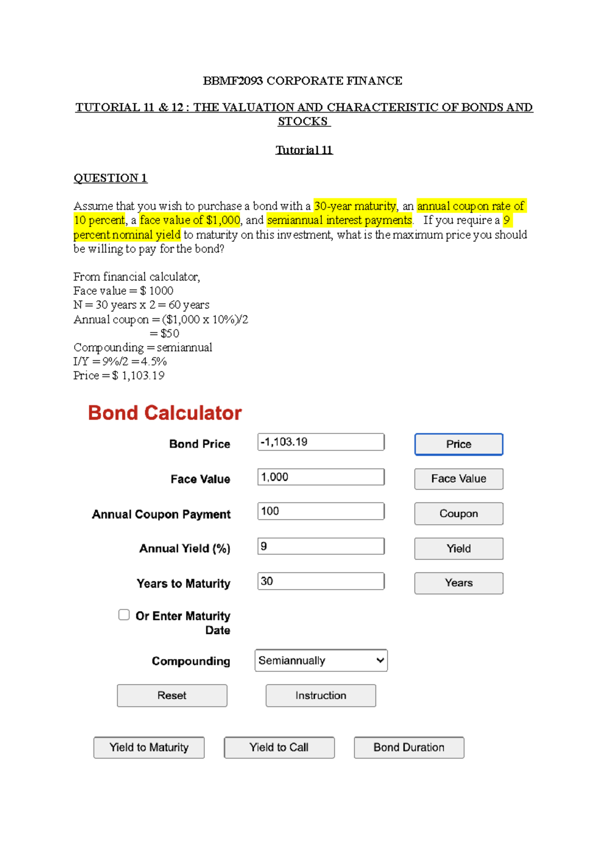 Business Finance tutorial - Business Finance tutorial Question 3: C = 7 ...