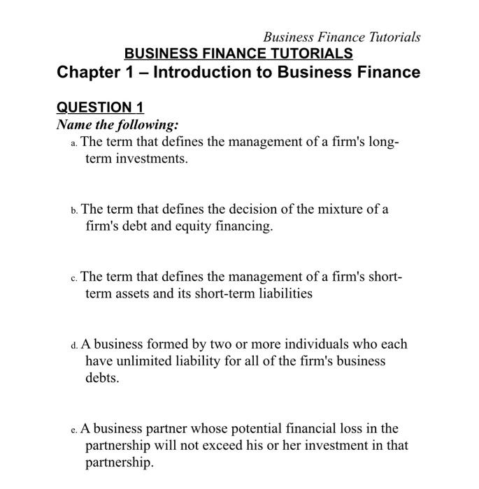 Solved Business Finance Tutorials BUSINESS FINANCE TUTORIALS | Chegg.com