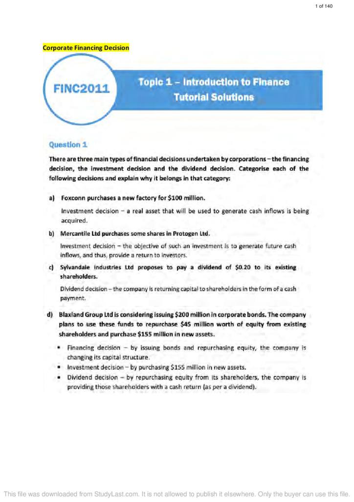 Corporate Finance I (FINC2011) HD tutorial notes with solutions | StudyLast