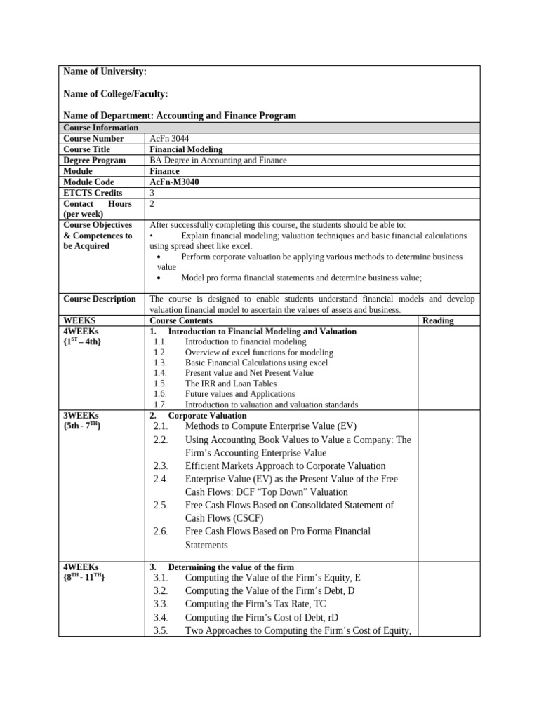 Syllabus For Financial Modeling in Excel | PDF | Financial Modeling ...