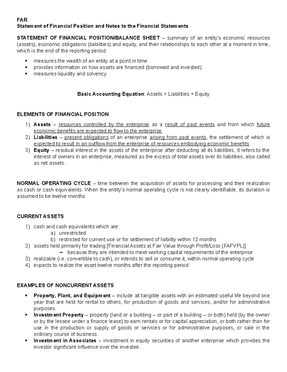 FAR 101: Statement of Financial Position & Notes Summary Guide - Studocu