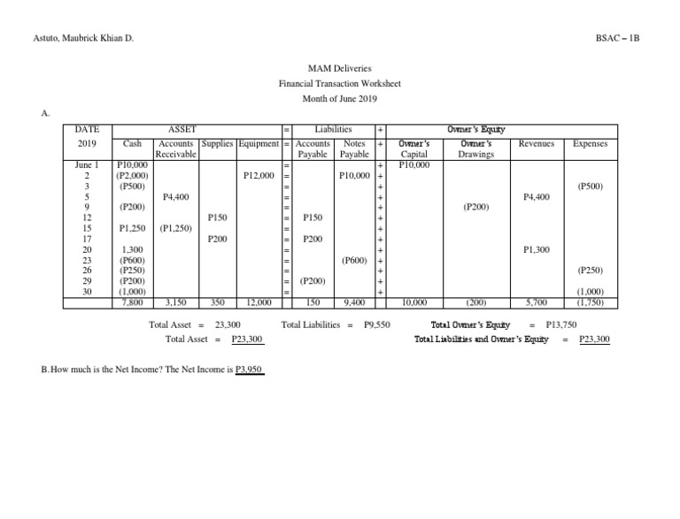 Financial Transaction Worksheet | Problem and Solution | Basic ...