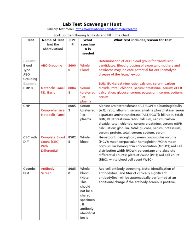 Lab Test Scavenger Hunt Guide | PDF | Blood Plasma | Alanine Transaminase