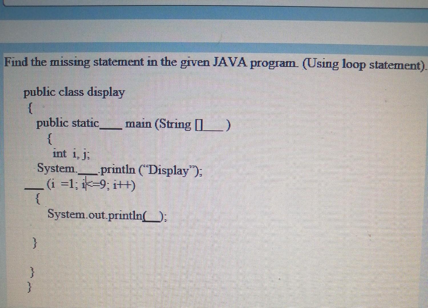 Solved Find the missing statement in the given JAVA program | Chegg.com