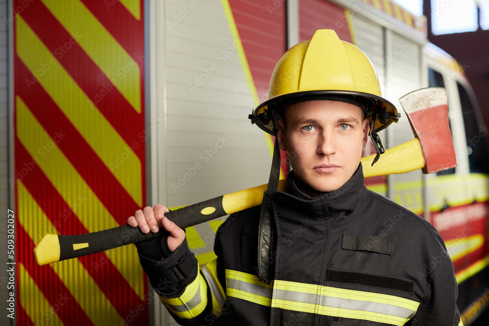 Firefighter fully equipped with helmet and ax in fire truck background ...