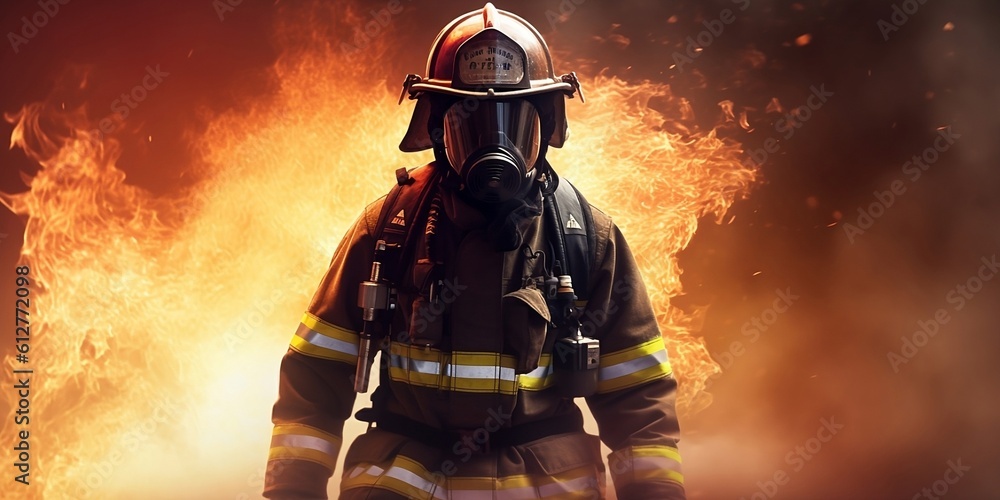 A brave fireman wearing protective uniform standing next to a fire ...