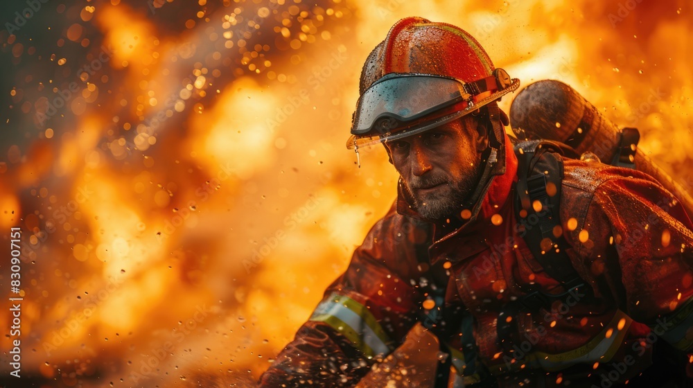 Firefighter in fire fighting operation. Portrait of a heroic fireman in ...