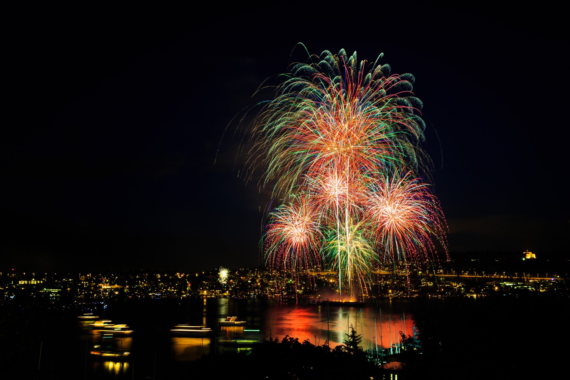 Amazing fireworks illuminating the night sky, viewed from the serene ...