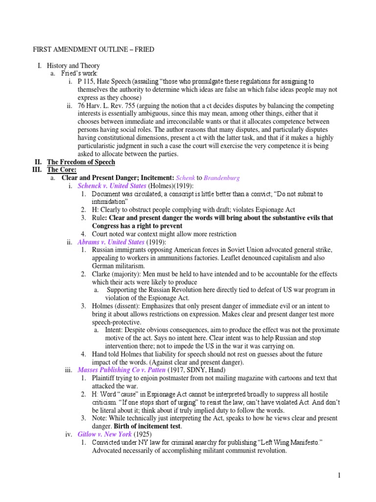 First Amendment Outline (Fall 2021) - Key Theories & Case Studies - Studocu