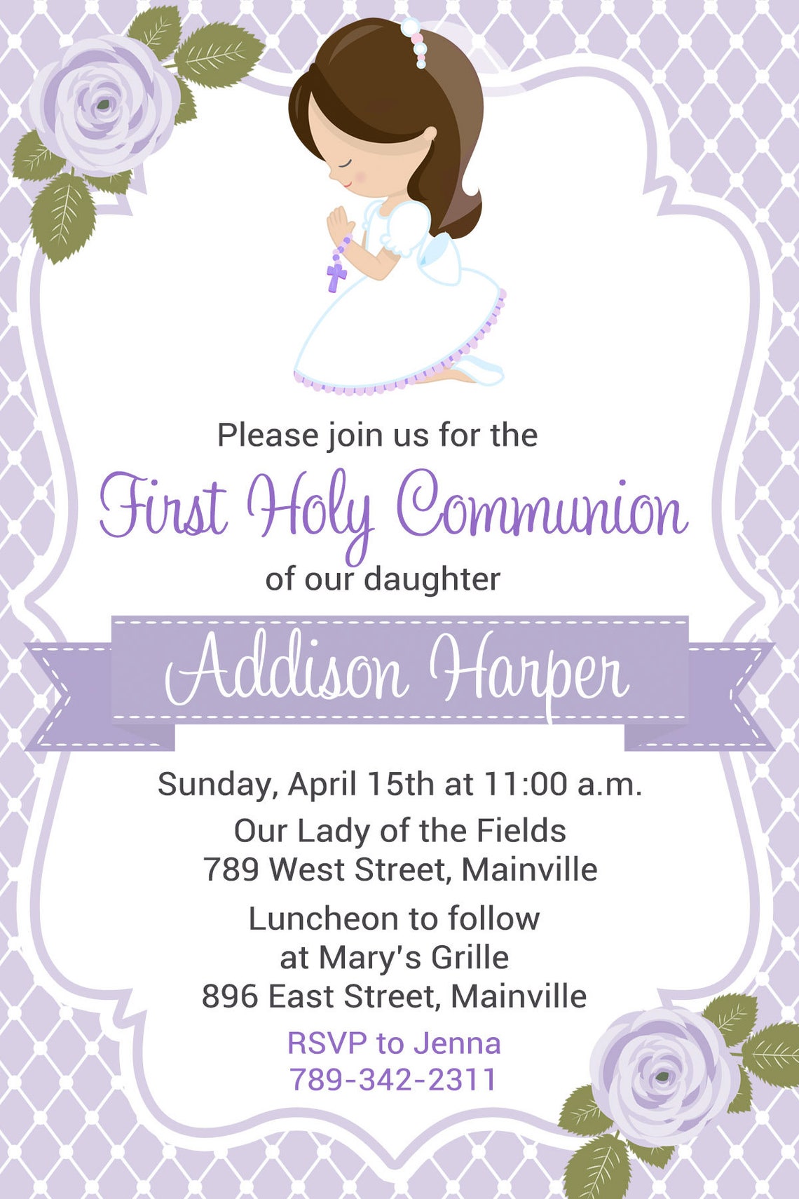 First Communion Invitation, Communion. Girl, Purple, ANY HAIR COLOR ...