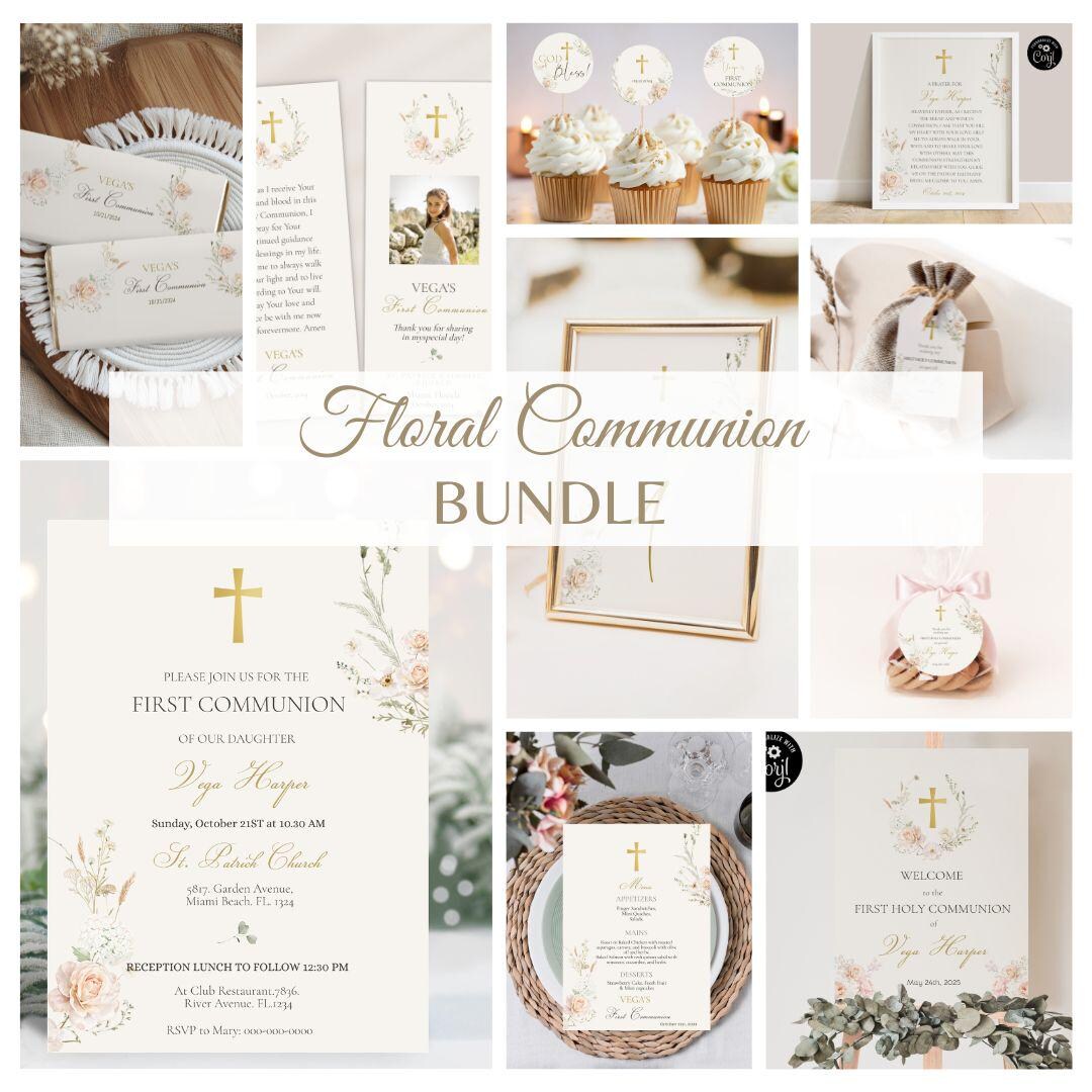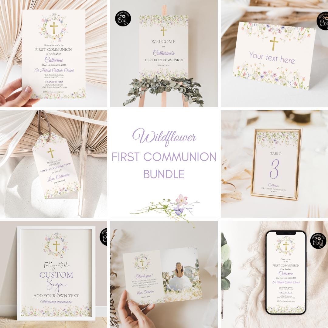 Floral First Communion Invitation Bundle Template, Wildflower Holy ...
