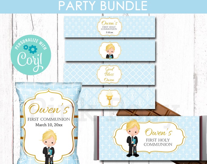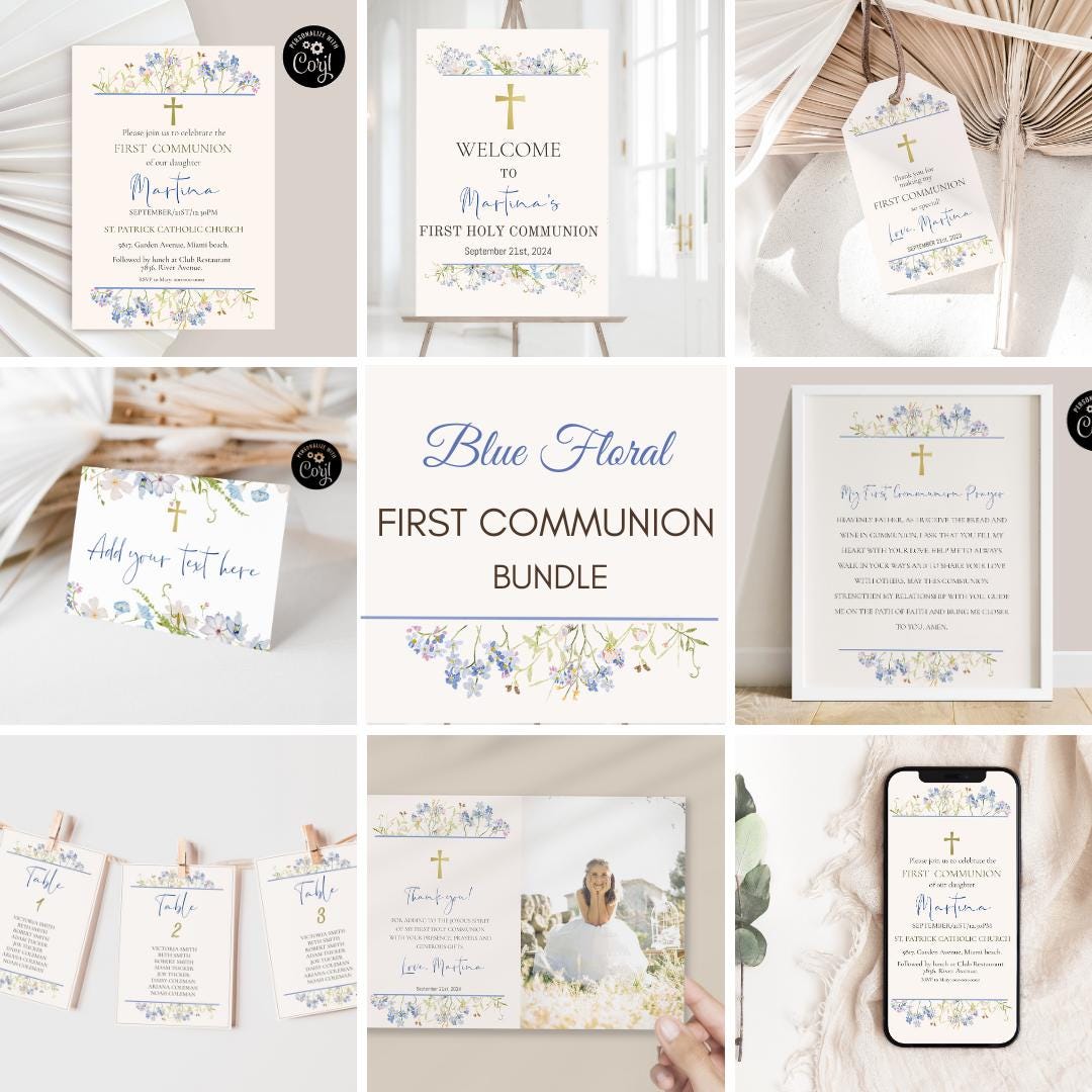 Wildflower First Communion Invitation Bundle, Editable Blue Floral ...