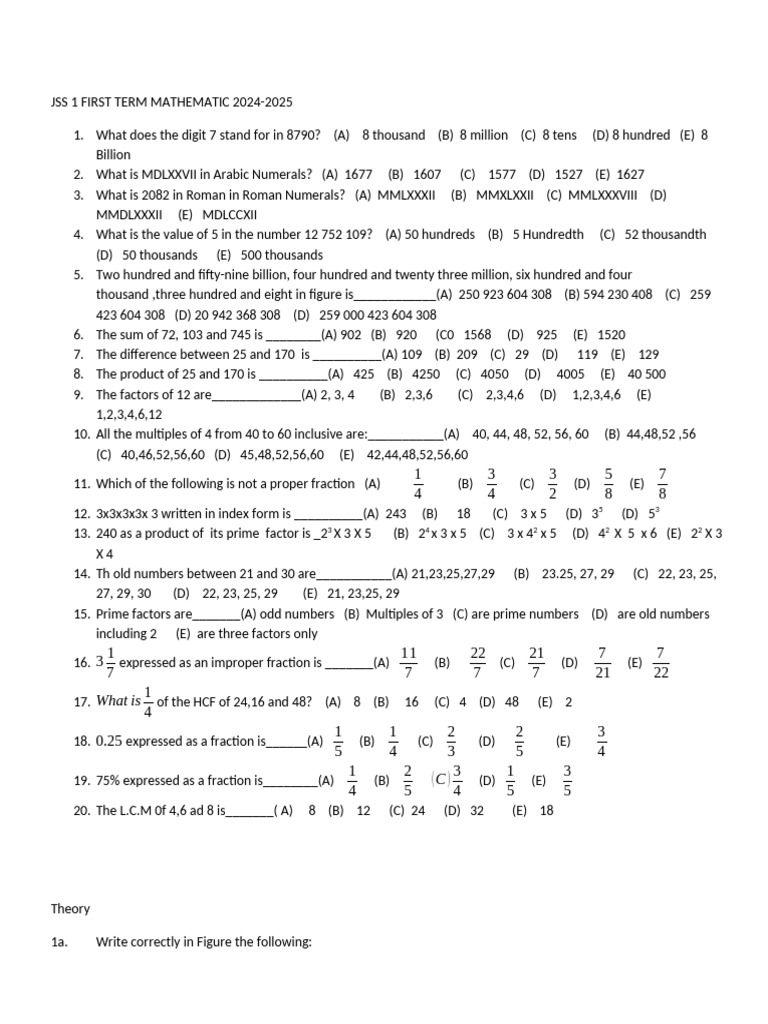 JSS1 First Term Math Questions 2024-2025 | PDF | Mathematics | Lexicology