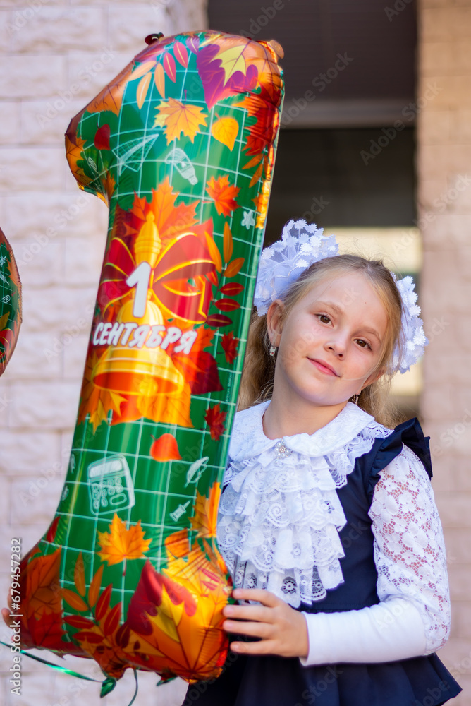 The first time in the first class! A first-grader girl in a beautiful ...