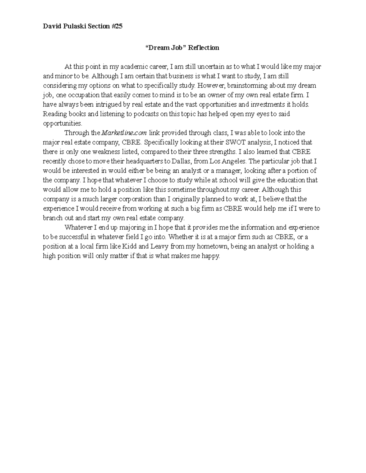 “Dream Job” Reflection - Although I am certain that business is what I ...