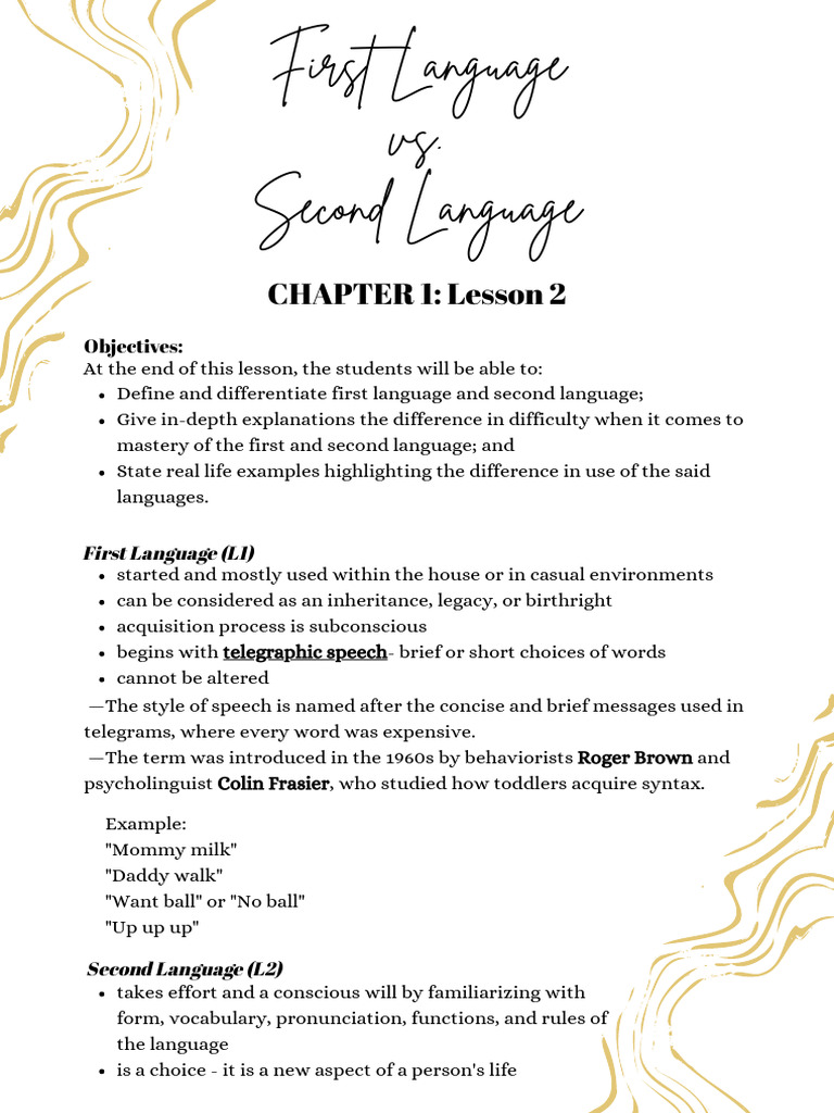 Chapter 1-Lesson 2 - First Language vs. Second Language Handout ...