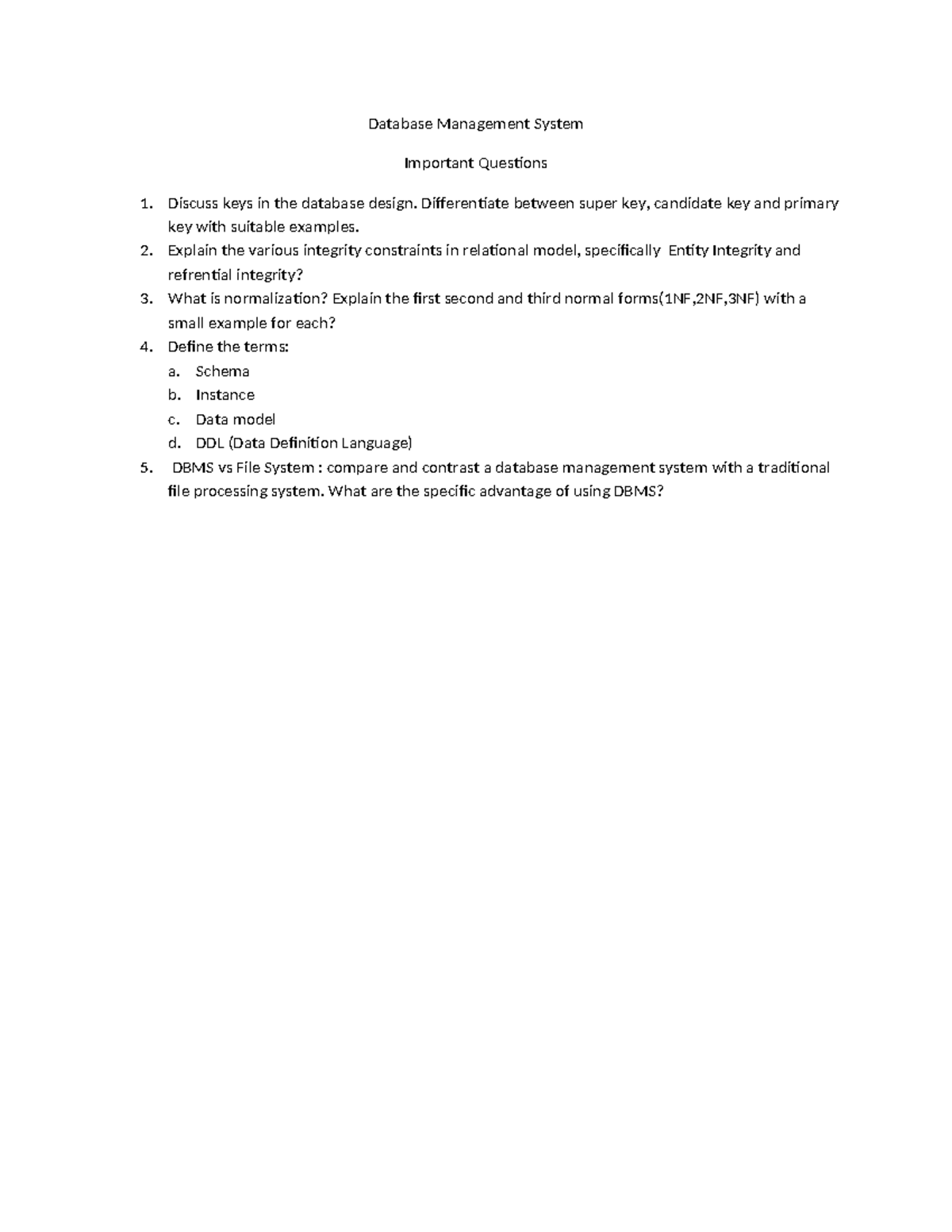 DBMS Important Questions: Keys, Integrity, Normalization & More - Studocu