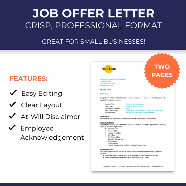 Offer Letter Template | Editable & Easy to Use | Great for Small ...