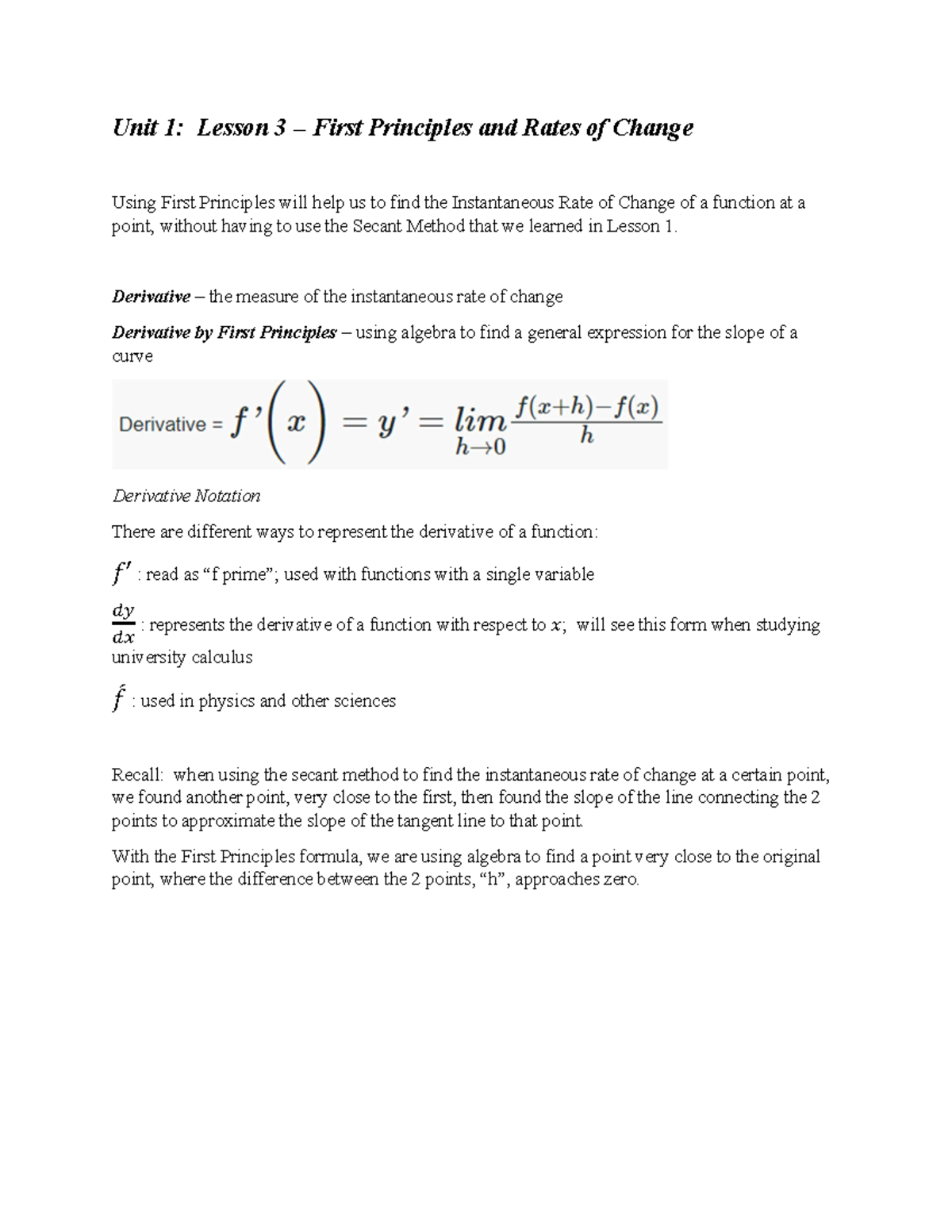 Unit 1 - Lesson 3 - Derivatives via First Principles Handout - Studocu