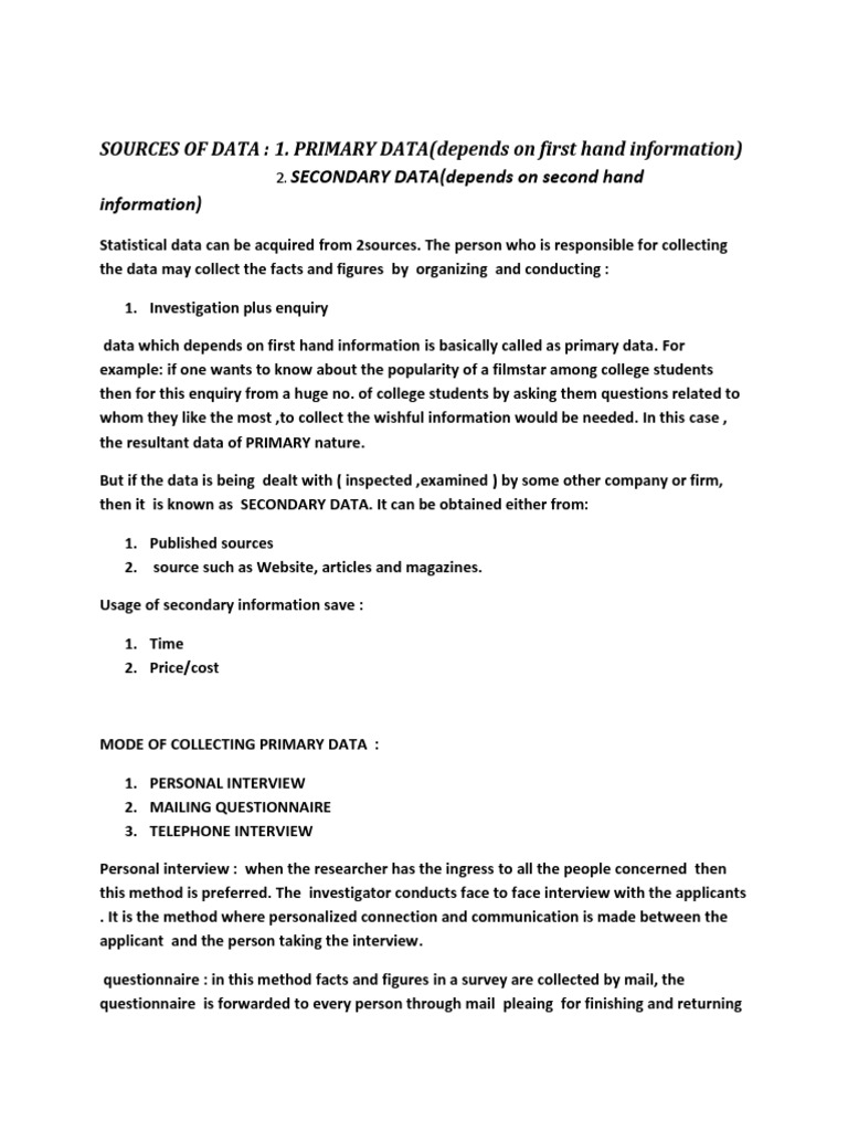 SOURCES OF DATA: 1. PRIMARY DATA (Depends On First Hand Information ...