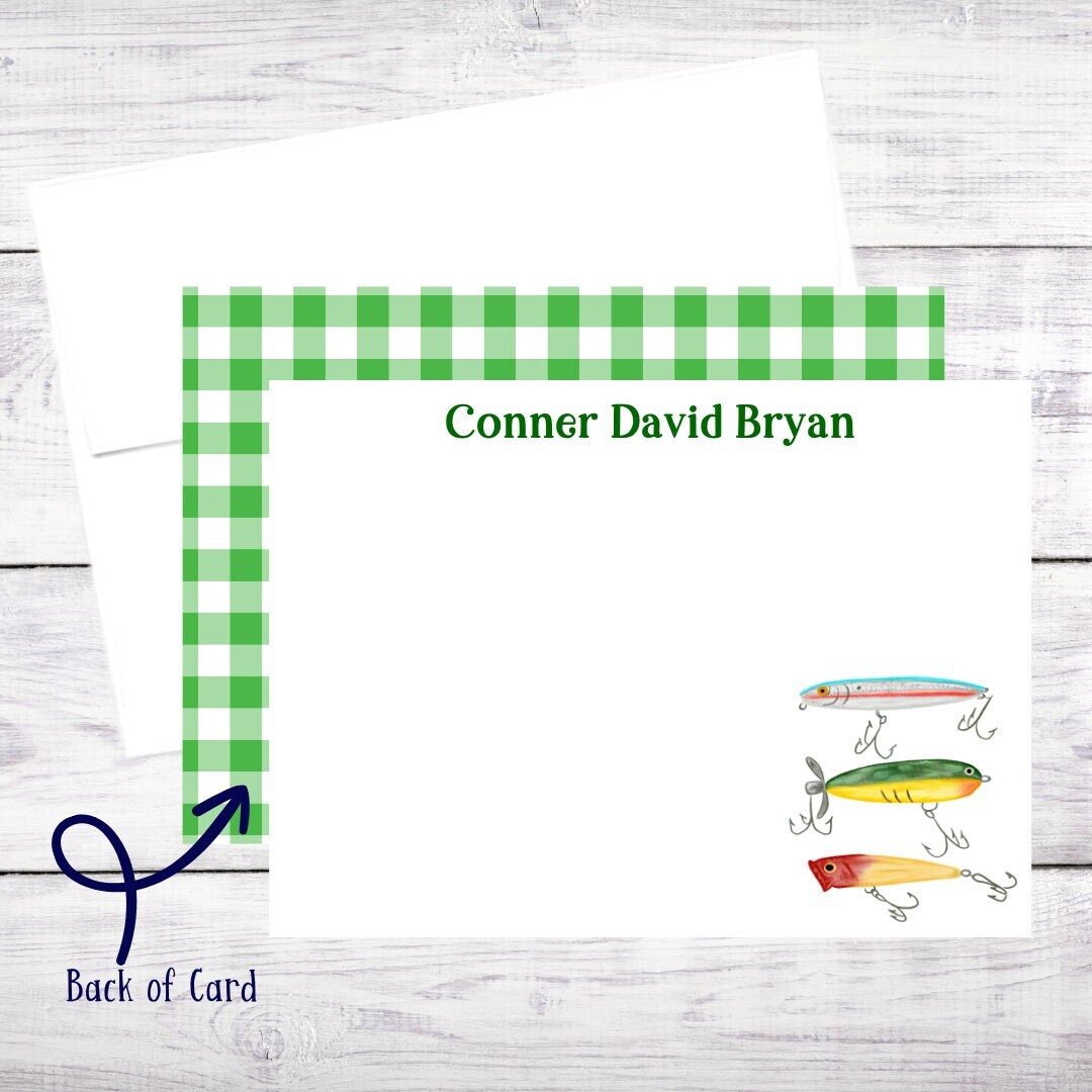 20 Personalized Fishing Note Cards: Green Gingham Stationery Set - Etsy