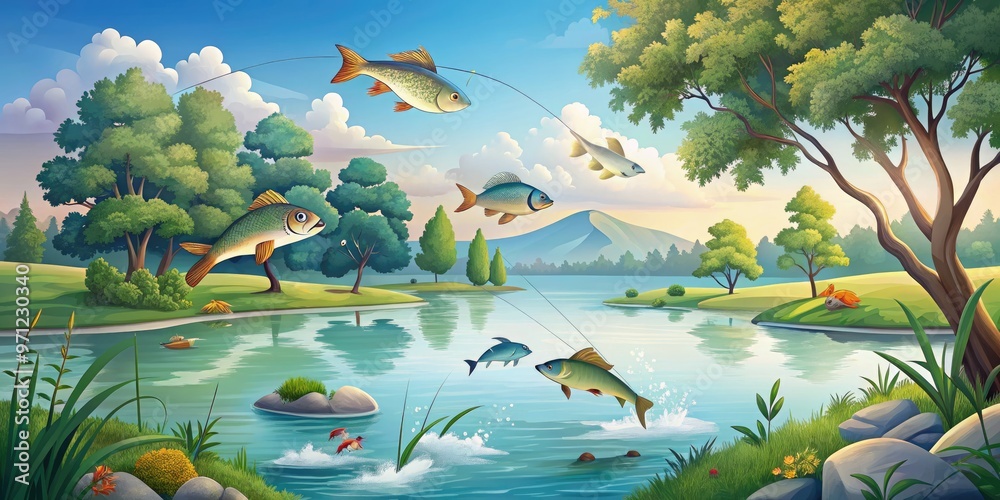 Whimsical illustration of a fishing scene featuring a serene lake ...