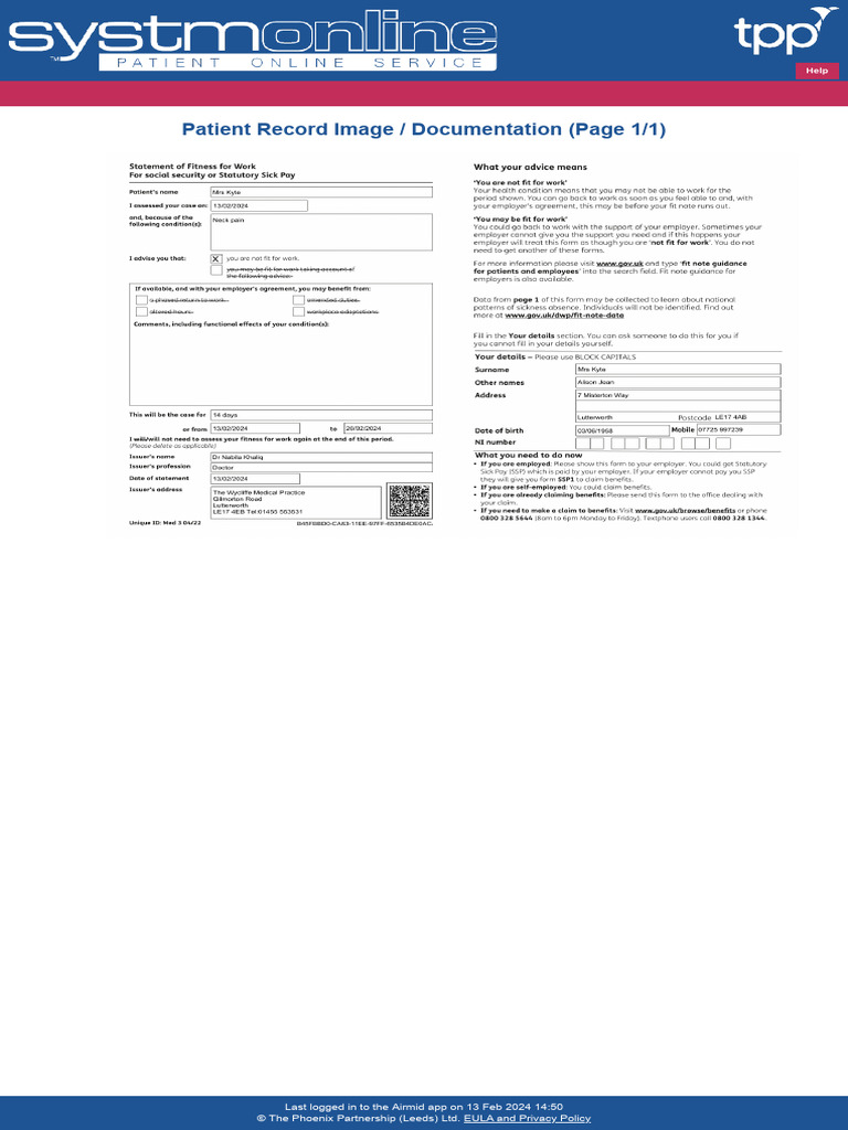 Fit Note for Mrs. Kyte's Work Status | PDF