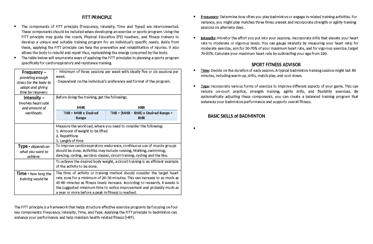 FITT Principle Application in Exercise Programs for PE (PE101) - Studocu