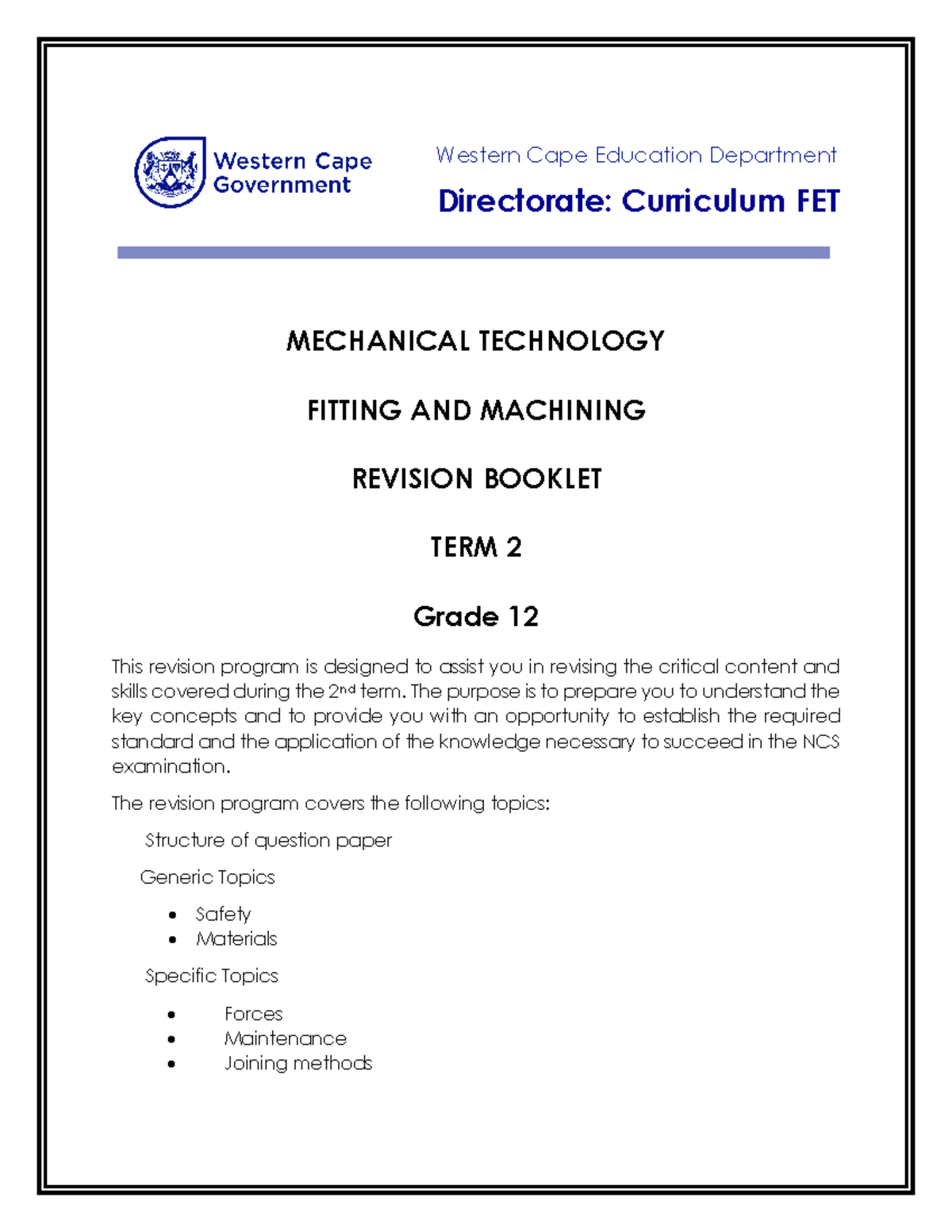 Grade 12 Mechanical Technology (Fitting & Machining) Term 2 Revision ...