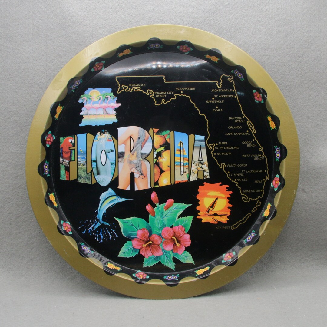 Vintage Florida State Map Souvenir Round Metal Tray, Hibiscus, Key West ...