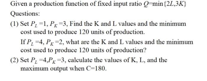 Solved Given a production function of fixed input ratio | Chegg.com