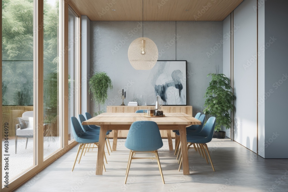 Cozy soft light midcentury modern dining room with spring pastel blue ...