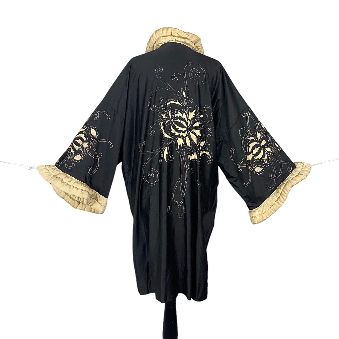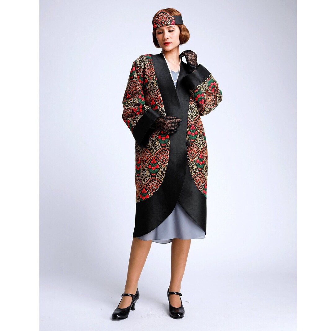 Size M - Black 1920s Embroidered Silk Art Deco Coat, 20s Great Gatsby ...