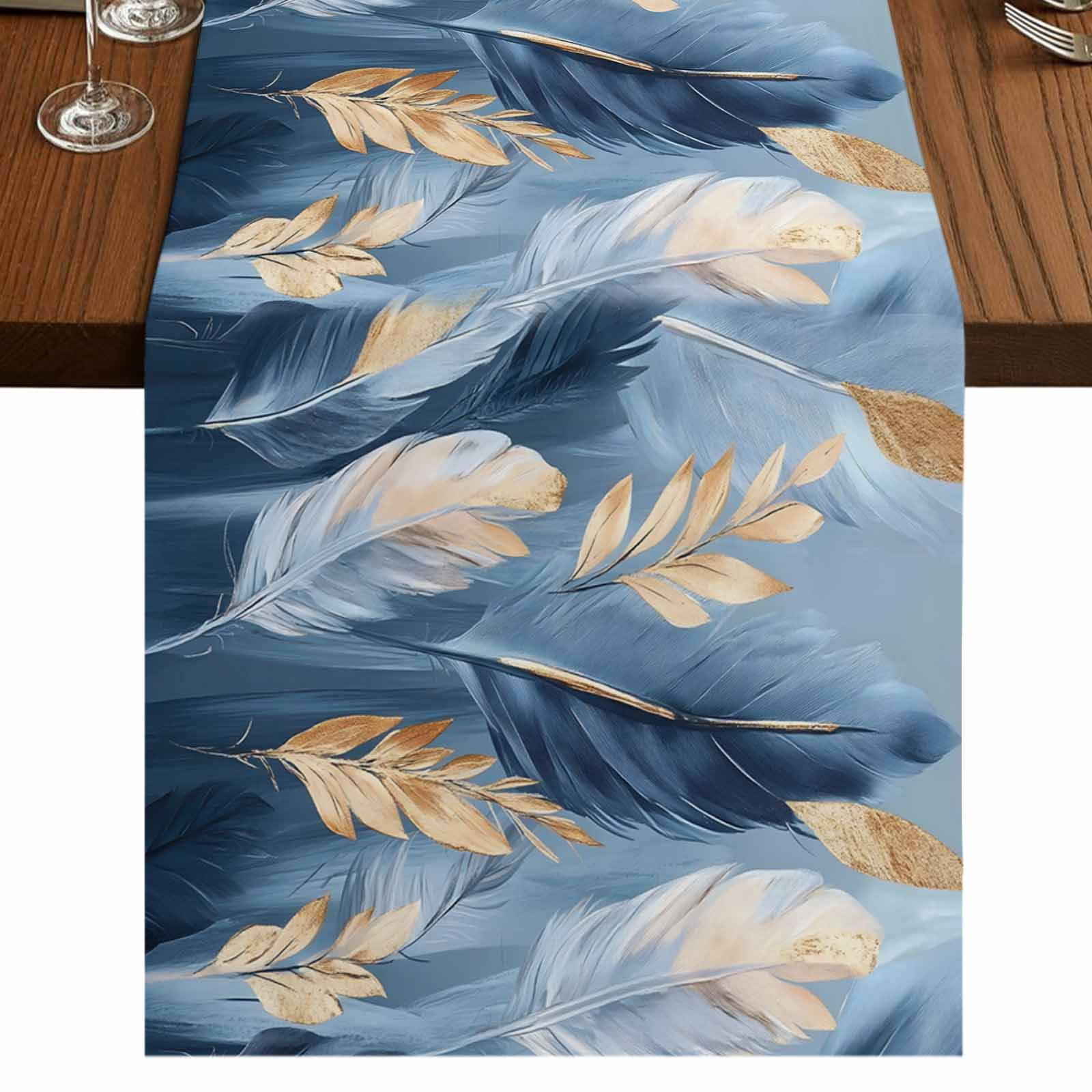 Blue Gold Feather Short Table Runner 60 Inches Long,Modern Oil Painting ...