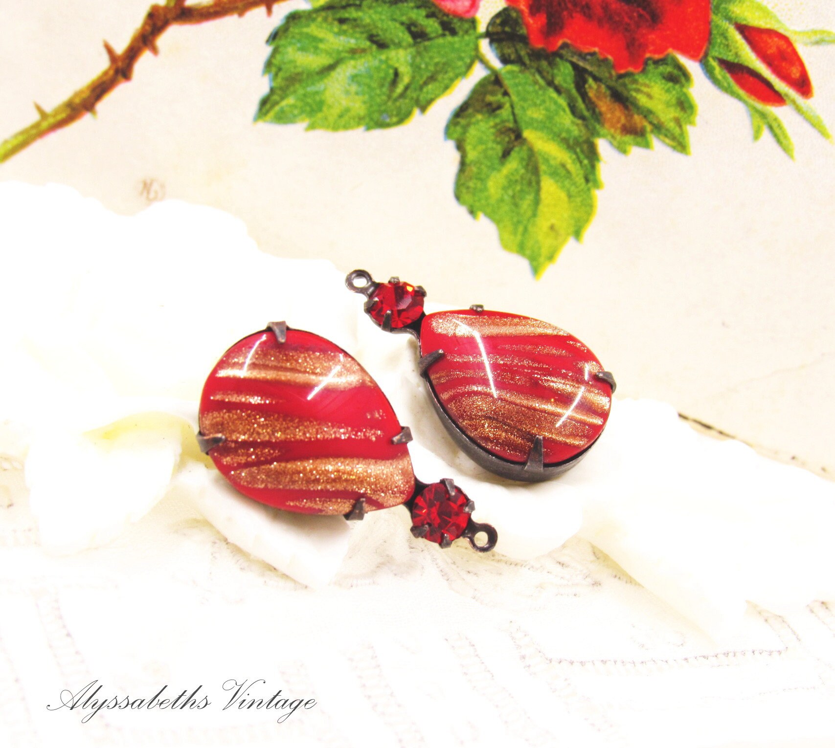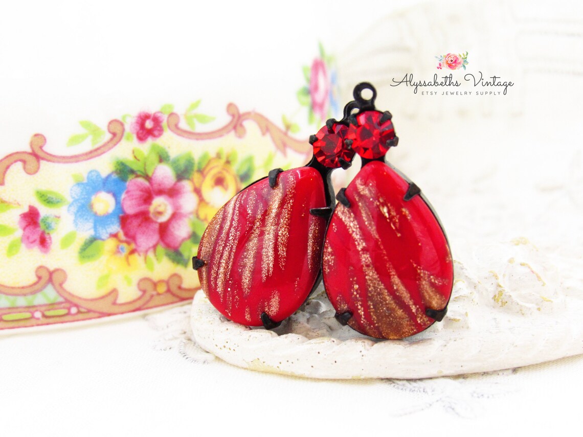 Retro Vintage Opaque Red & Gold Fleck Pear With Ruby Red Austrian ...