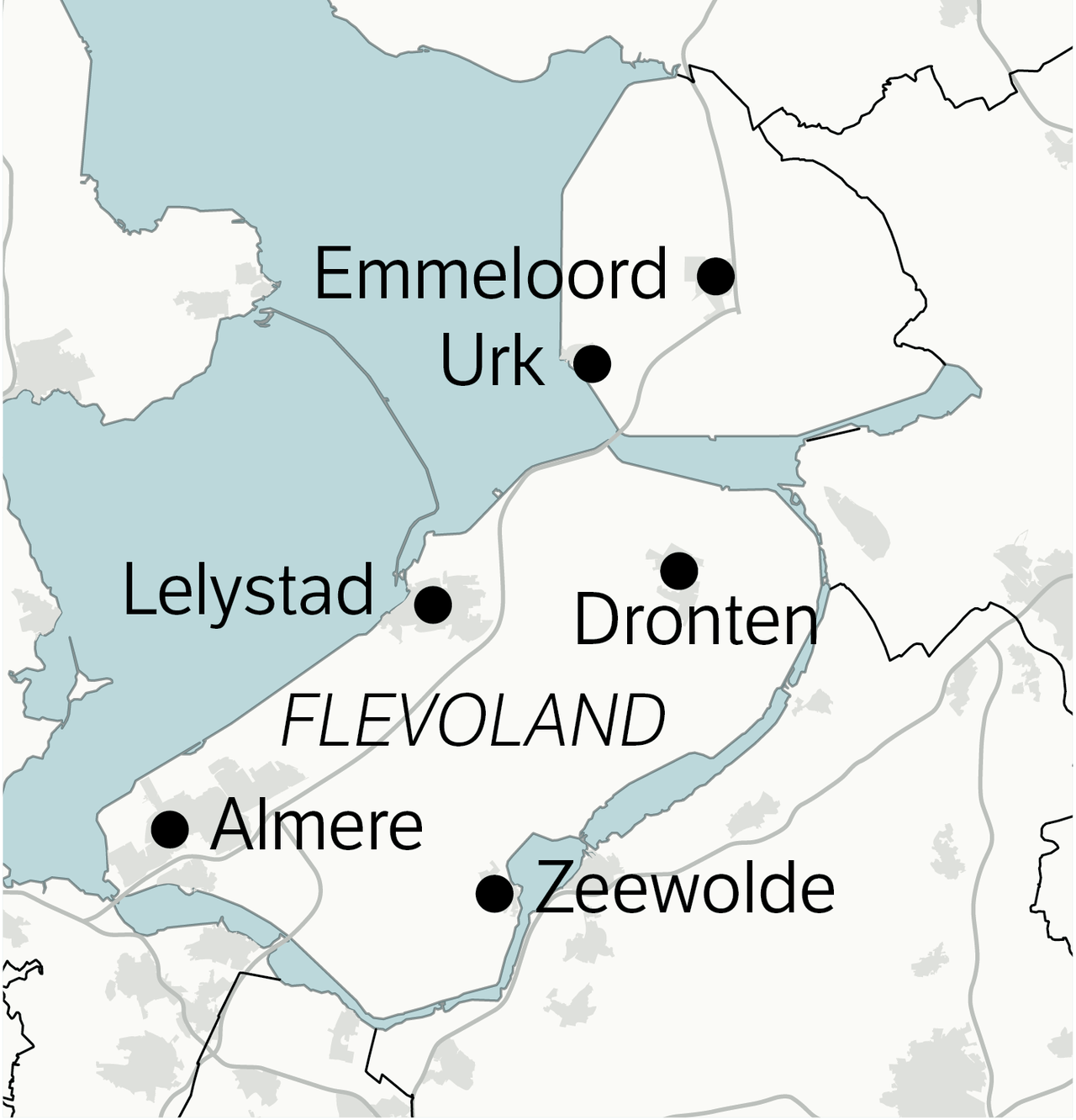 Map of Flevoland with cities and towns
