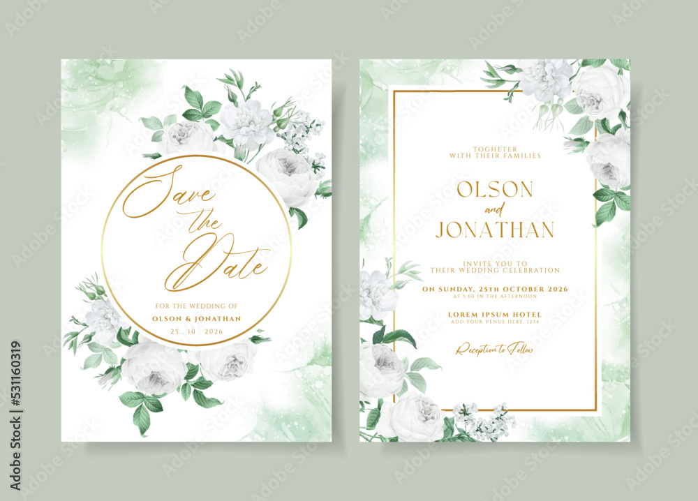 Floral wedding invitation template set with white floral and leaves ...