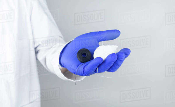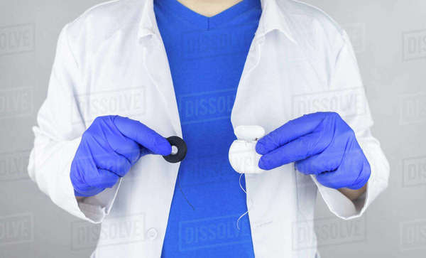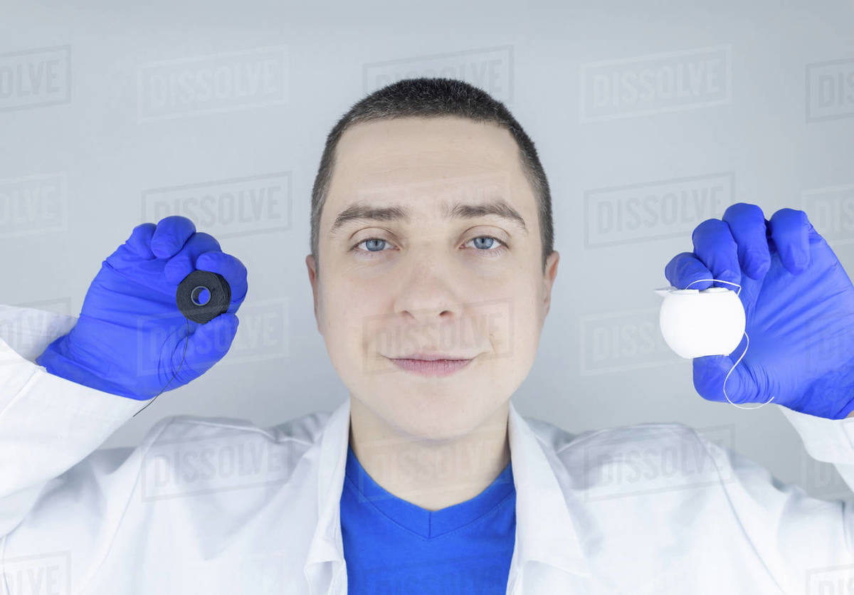 Dental floss close up. Dentist shows how to use the thread correctly ...