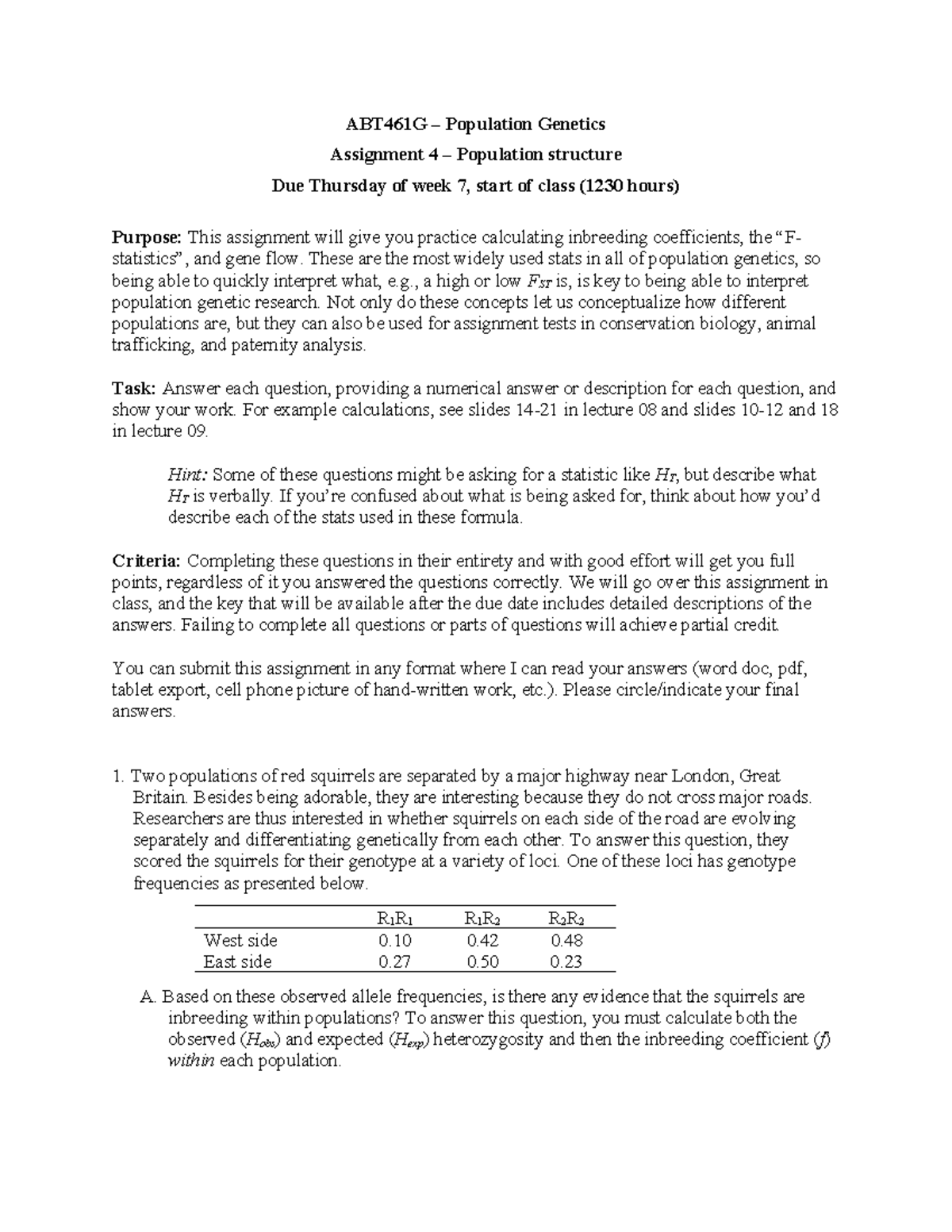 ABT461G Population Genetics Assignment 4: Analyzing Inbreeding & Gene ...