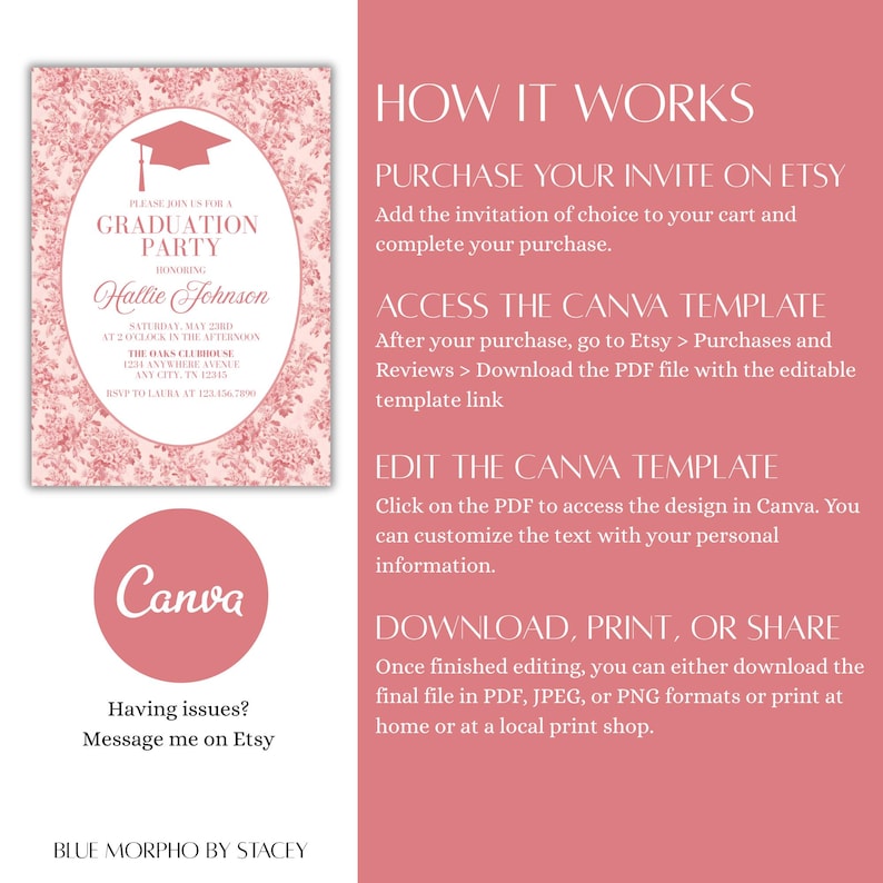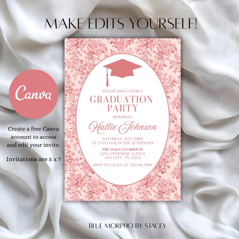 Floral Graduation Invitation Template | Pink Toile (canva Template) - Etsy