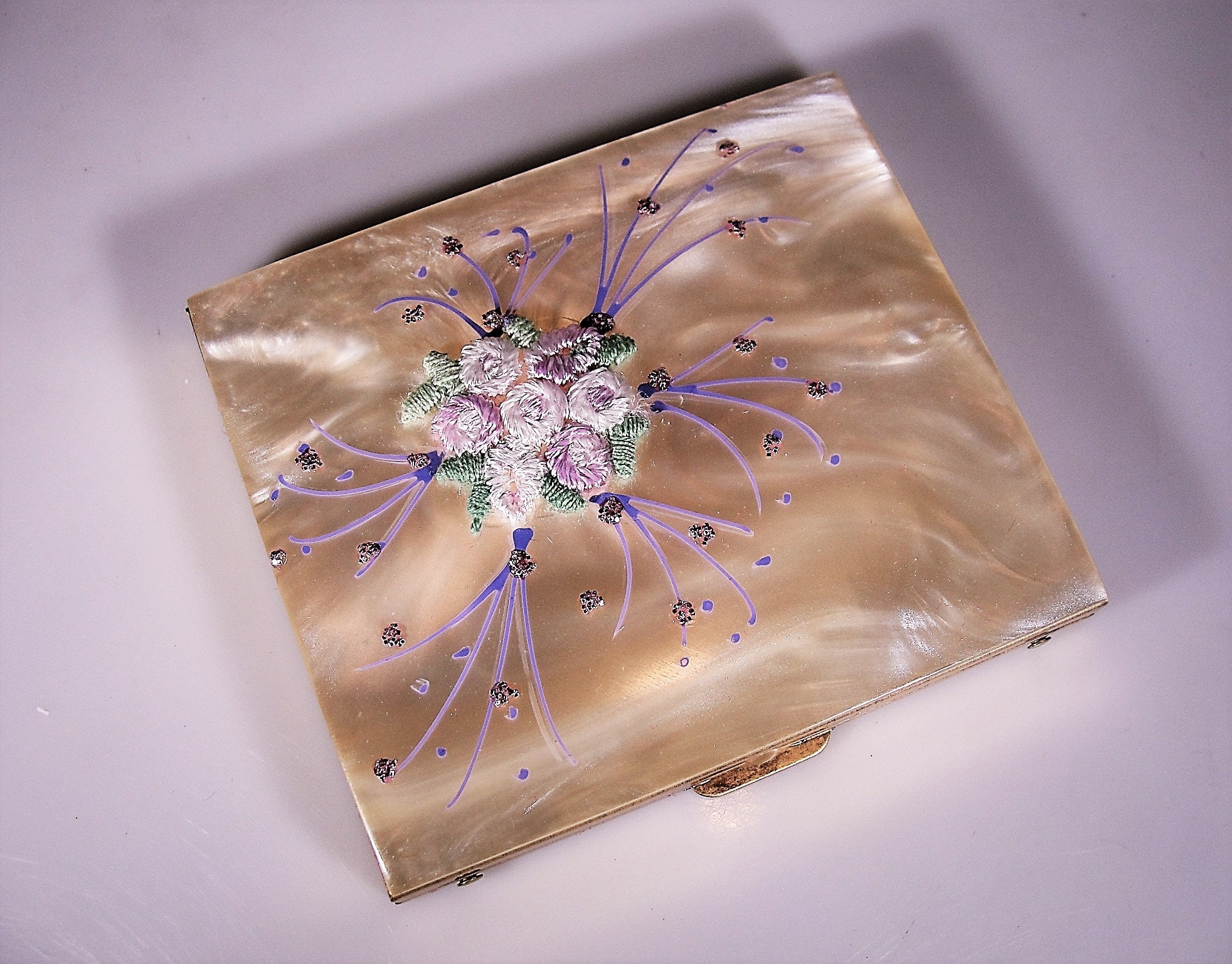Powder Compact, Lucite Compact with Purple Embroidered Flowers & Hand ...