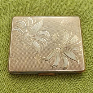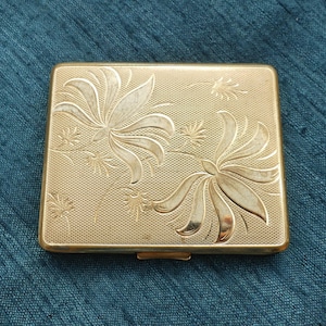 An attractive vintage woman's powder compact featuring a floral design.