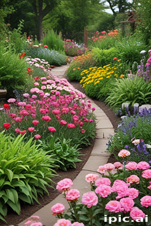 A Vibrant Garden Pathway Surrounded by Colorful Blooms and Lush Foliage.