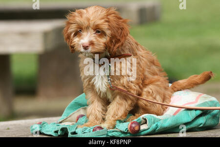A cute fluffy red colored Cavapoo puppy eating a treat Stock Photo - Alamy
